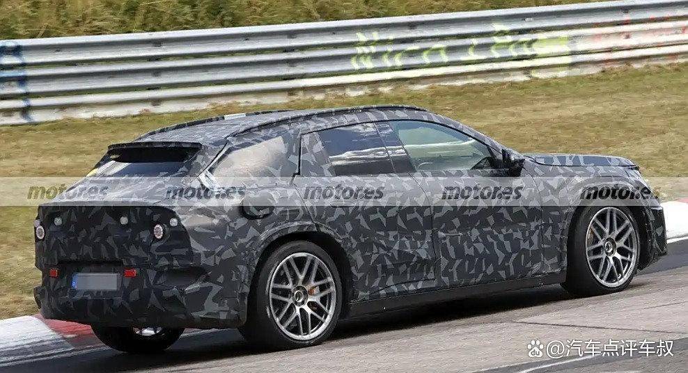 从侧面看,新车将采用大角度倾斜的车尾造型,不过没有配备超长的大尺寸扰流板,预计最终量产版会有调整。另外,新车预计车长约5米,会配备22英寸轮圈,测试车型轮胎规格为前285/40 ZR22,后325/35 ZR22。